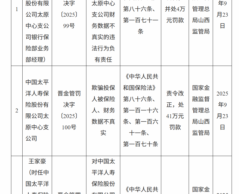 9月28日,国家金融监督管理总局山西监管局行政处罚信息公开表显示,中国太平洋人寿保险股份有限公司太原中心支公司因欺骗投保人被保险人、财务数据不真实被责令改正,处41万元罚款。刘某东因财务数据不真实被警告景盛配资,并处4万元罚款。王某豪因财务数据不真实被警告,并处1万元罚款。张某皓因欺骗投保人、被保险人被警告,并处4万元罚款。